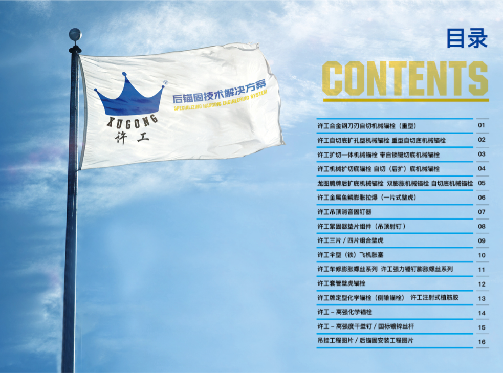 公司產(chǎn)品有:許工牌單槍吊頂緊固器、雙槍吊頂緊固器、吊頂射釘墊片組件系列、合金鋼刀刃自切擴(kuò)孔機(jī)械錨栓、金鋼石自切擴(kuò)孔錨栓、重型多刀刃切底錨栓、后擴(kuò)底機(jī)械錨栓、擴(kuò)切一體機(jī)械錨栓、金屬魚(yú)鱗拉爆分體系列、金屬魚(yú)鱗連體拉爆型、定型化學(xué)錨栓(倒錐錨栓)、內(nèi)爆(脹)型、車(chē)修壁虎型、錘擊壁虎型、金屬脹栓型、三片、四片組合壁虎系列、傘型脹栓(鐵飛機(jī))系列、中空壁虎系列、國(guó)標(biāo)化學(xué)錨栓系列、環(huán)氧/快固植筋膠系列、不銹鋼背栓、鋁掛件、插片壁虎、電力壁虎、保溫釘系列、高強(qiáng)度通絲吊桿、高強(qiáng)自攻絲、華司系列等。廣泛用于工程吊頂、鋼結(jié)構(gòu)加固、干掛石材、幕墻龍骨安裝、機(jī)械設(shè)備、電梯、鋼木樓梯、吊掛風(fēng)管、各種承重支架、輕鋼龍骨吊頂、電纜橋架、高速公路及各種管道的吊掛錨固。